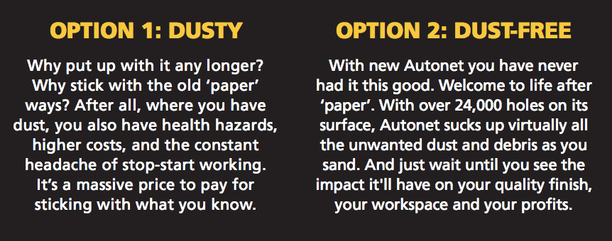 MIRKA was looking to launch a revolutionary product on the Auto market: "a sander that sucked". Our challenge was to inject some humour into a dry campaign. So the ad got talked about - and so free demos were requested. The product was SO revolutionary, it was almost boring... until we compared it to the alternative. (And the result of this campaign? The client scooped Volkswagen as a client and became number two in the market to 3M.)